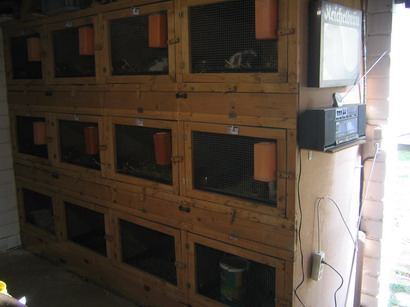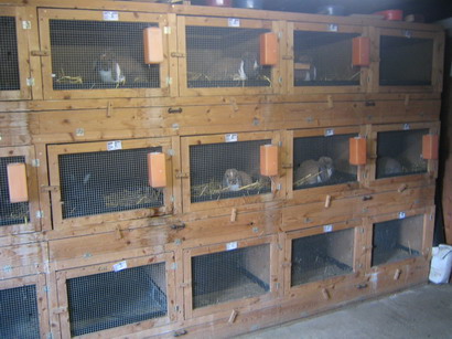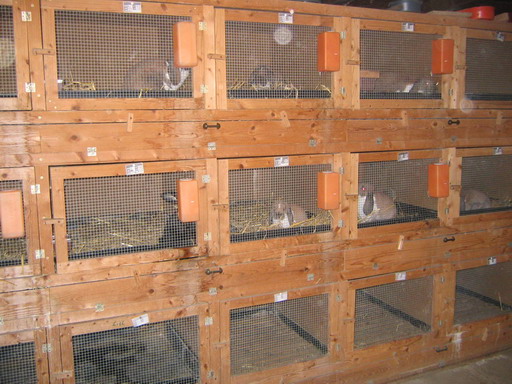 Ich habe eine Innenstallanlage mit 30 Buchten und eine Aussenstallanlage mit 12 Buchten in der meine Alt- bzw. Zuchttiere sitzen. Ich halte meine Tiere mittlerweile in Kotwannen mit Einstreu aus Sägemehl und Stroh. Die ersten 7 Jahre züchtete ich die Deutschen Widder grau die auf Holz- bzw. Kunststoffrosten gehalten wurden. Bei der Haltung auf Rosten hatte ich keinerlei Schwierigkeiten mit Kokzidiose oder anderen Kaninchenkrankheiten. Seit ich meine Tiere auf Einstreu halte habe ich leider jedes Jahr ein paar Junge die an Kokzidiose erkranken. Diese Tiere werden mit Beicox oder Kolosan behandelt und werden dann schnell wieder gesund. Vorbeugend gebe ich momentan keine Medikamente da ich so besser erkennen kann wie anfällig bzw. robust die Tiere sind.